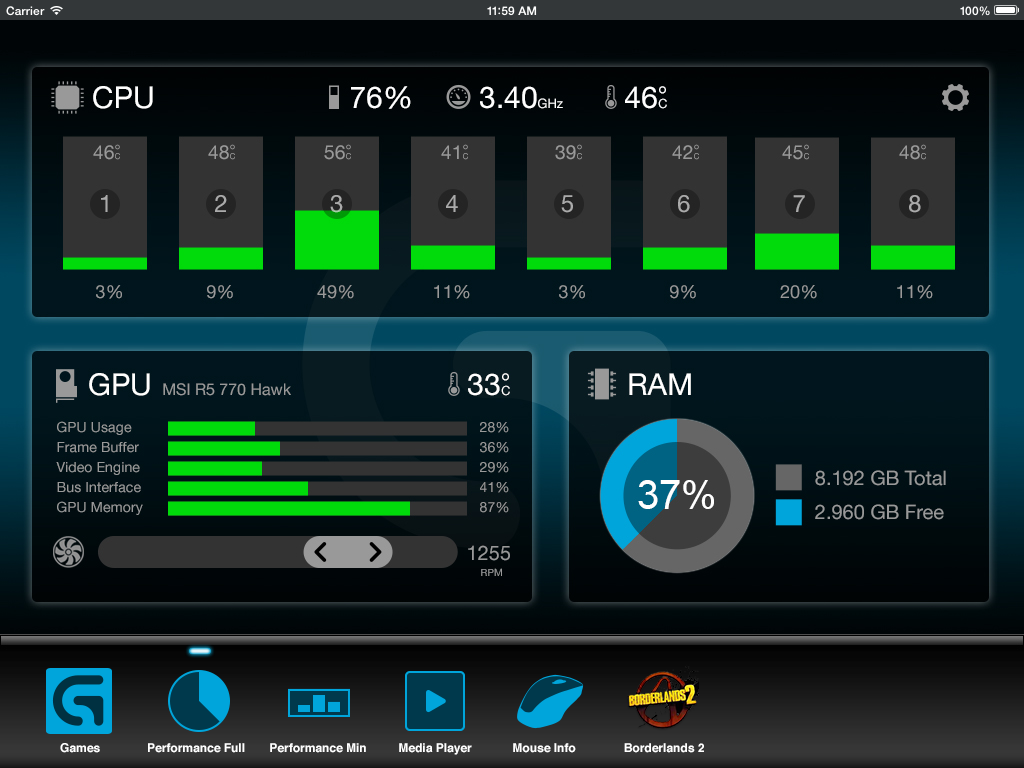 Arx Control is a mobile app that, when used in conjunction with Logitech gaming keyboards, provides critical in-game and system information, serving as a second screen. Developed for tablets and phones, the app lets gamers monitor and control peripheral devices without leaving their game, and provides a range of functions, including running game macros, troubleshooting/monitoring of system hardware, and controlling media or launching games remotely.