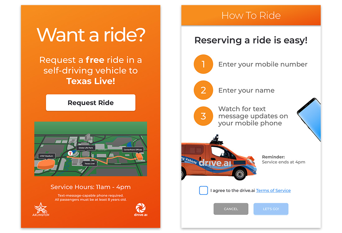 drive.ai was a pioneer startup in autonomous transportation industry. Our goal was to develop self-driving technology and use vans equipped with robotics and sensors to demonstrate the technology. We were one of the first companies to earn revenue via pilot programs started in the cities of Frisco and Arlington, Texas, while running test routes in Mountain View, California. As Senior Visual Designer at drive, I led visual design efforts across a range of media, including mobile applications, print, and displays. Several of the larger projects I was involved in are described below.