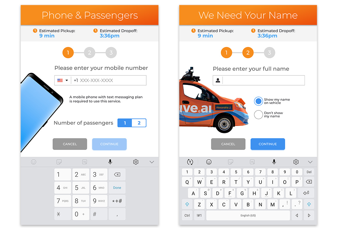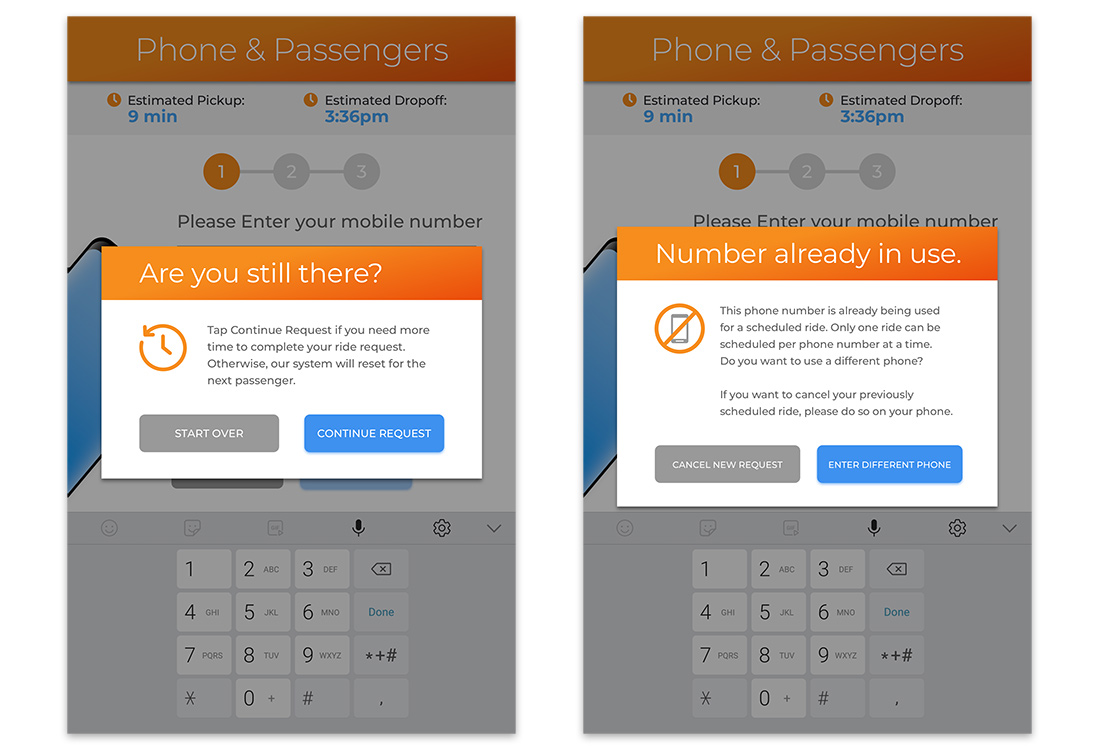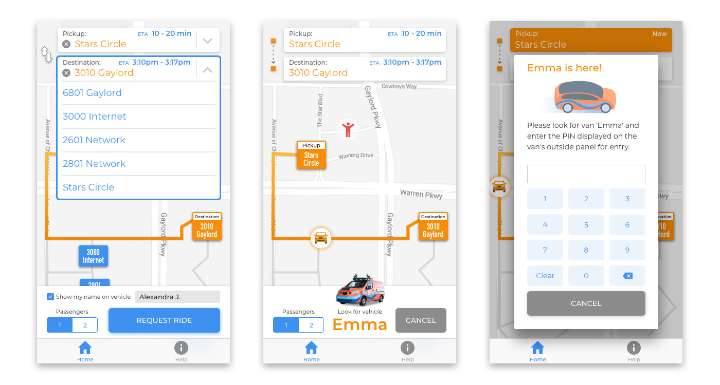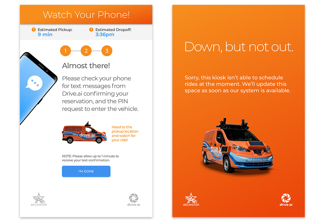 The pilot program we started in Arlington Texas was designed to cater to transient visitors for sports events, business conferences, etc. We couldn't rely on visitors having access to our mobile app, so we developed a kiosk system that allowed passengers to schedule rides at different locations around the city. This interaction presented a challenge in that passengers had no way to enter an identifying PIN to access the vehicles. So we established a text messaging sequence that kept passengers updated about the status of their rides, and enabled them to identify themselves by responding to messages.