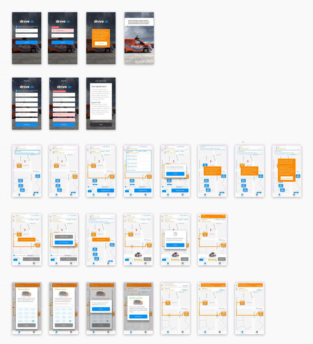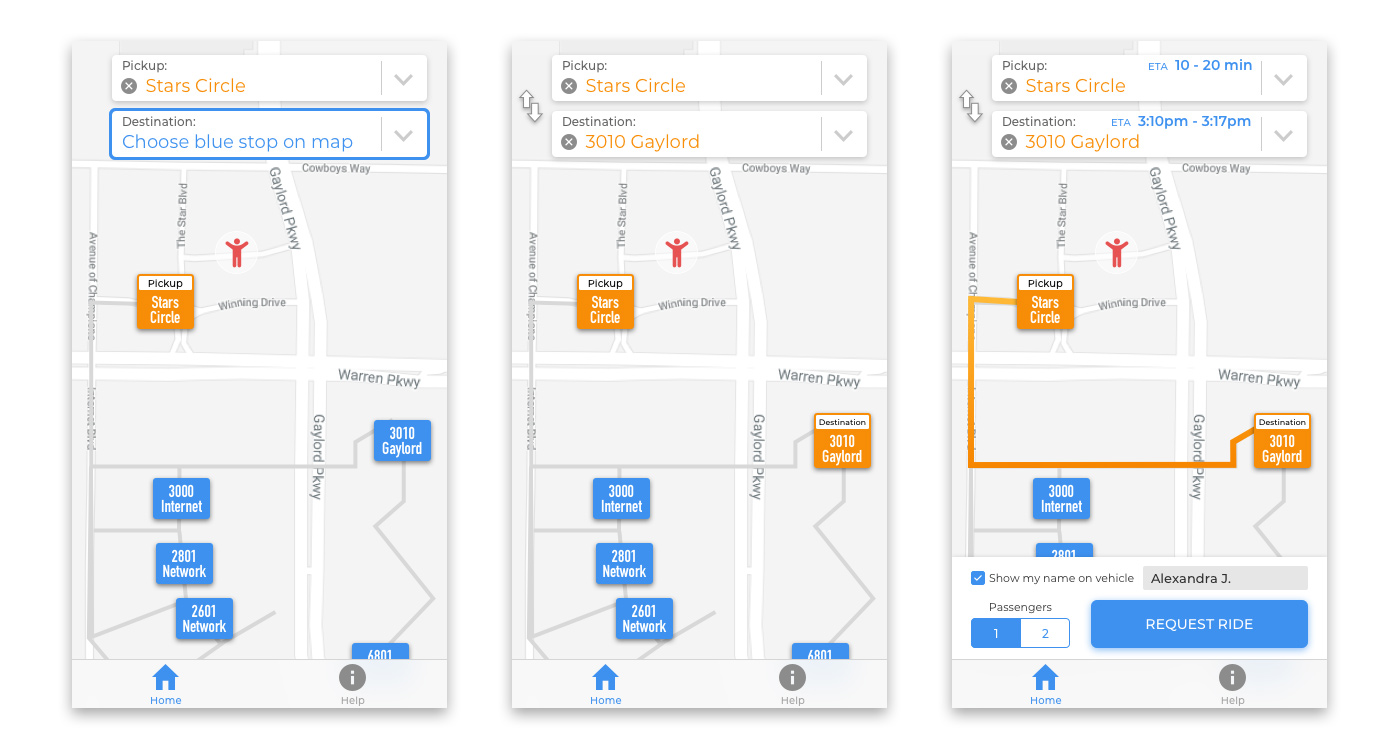 The original design for drive's mobile app was loosely based on common ridesharing interaction, similar to Lyft or Uber. When I started with the company however, we determined that the design wouldn't work for our needs because our pilot program could only service specially designated pickup and dropoff stops. I redesigned the app so passengers could access stops via tappable markers on the interactive map, or use a dropdown menu that listed available stops, a feature that was requested by multiple riders.