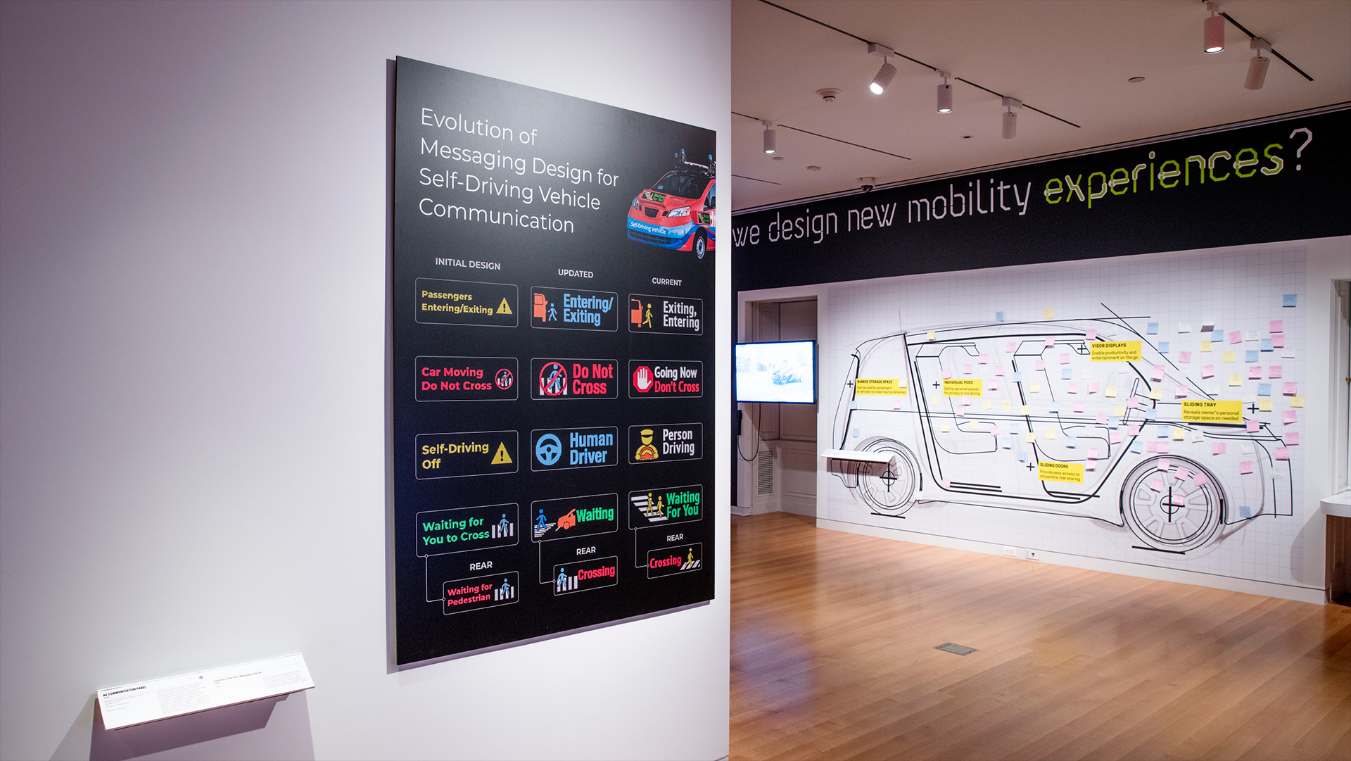 A gratifying outcome of my animation design work was being featured in a 2018-19 exhibit at the Smithsonian Cooper-Hewitt Design Museum titled "The Road Ahead: Reimagining Mobility". The installation included one of our panels mounted on a life-size print of our vehicle, along with a poster I created that showcased the evolution of our panel designs.
